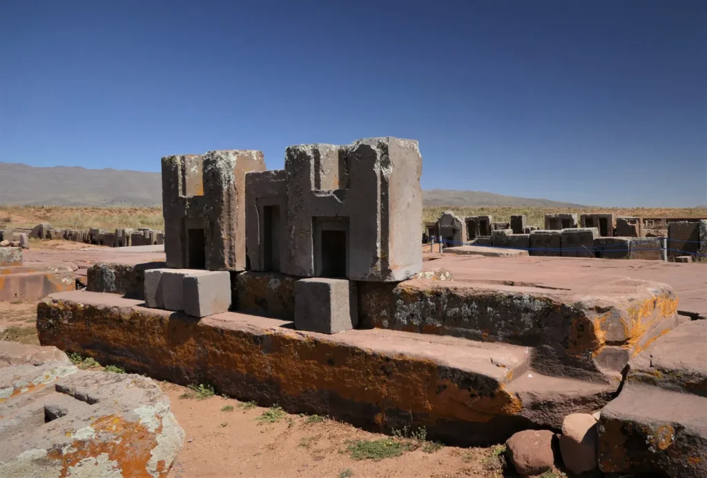 - Puma Punku: El sector más misterioso, con bloques de piedra de hasta 130 toneladas cortados con precisión milimétrica. Se usaron grapas de cobre para unirlos, una técnica avanzada.